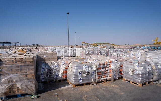 搬送待ちの物資 the Kerem Shalom Crossing, in the southern Gaza Strip, July 24, 2025. (Emanuel Fabian/Times of Israel)