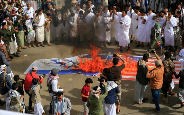 Yemenis burn flags of Israel and the US in the Houthi-run capital Sanaa on May 30, 2025. (Photo by Mohammed HUWAIS / AFP)