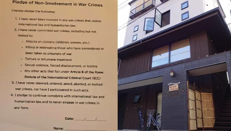 それによると、京都の若いバックパッカー向けのホテル、ウインドヴィラホテルが、イスラエル人宿泊客に、IDF従軍中に、「女性や子供への攻撃、捕虜殺害や拷問、レイプなどの国際法に違反する、戦争犯罪を犯していない」というような内容の誓約書に署名を強要したという。
