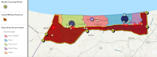 地図には、物資は外から搬入される検問所の位置や、ガザ内部での配布場所も提示されている。