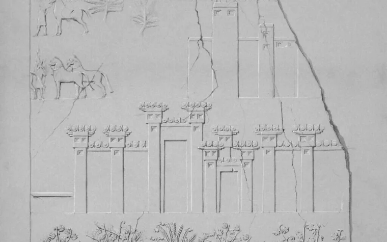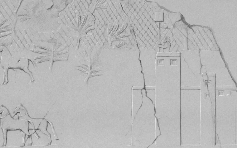 A rendering of slab 28 of the throne room of the Southwest Palace in Nineveh (modern Mosul), Iraq, created by British archaeologist Austen Henry Layard around 1850. (Trustees of the British Museum)