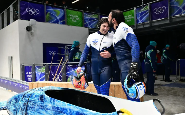 Israel’s Adam Edelman (front) and Menachem Chen compete in the bobsleigh men’s 2-man heat 1 at Cortina Sliding Center during the Milano Cortina 2026 Winter Olympic Games in Cortina d’Ampezzo on February 16, 2026. (FRANCK FIFE / AFP)