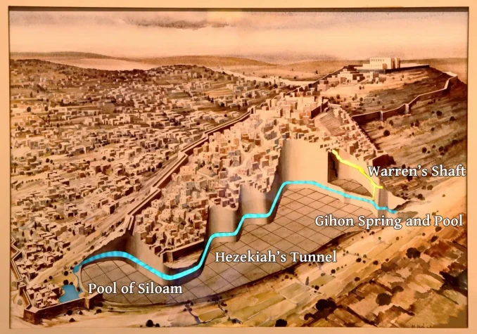 城壁の中には水がなかったことから、ヒゼキヤ王は、城壁の外にあったギホンの泉から、トンネルを作って、水を城壁の中に引き込み、シロアムの池に水を溜め込んだ。*この池の遺跡は今も残っている。