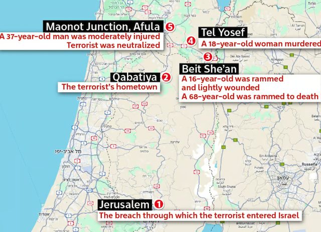 その約15分後の12時45分、アフラ入り口付近で、民間人のヤコブ・バーガーさん(37)が歩いていたところ、犯人の車東が追突してきて、頭部を負傷。犯人の車は電信柱に衝突した。そばにいた民間人が、犯人に向かって発砲し、負傷させた。