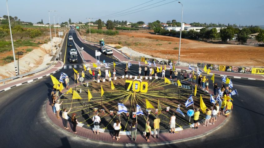 Protestors at Kikar Bet Berl near Kfar Saba mark 700 days of captivity in Gaza. (Gabriel Meltzer/Israel Pro-Democracy Protest Movement)
